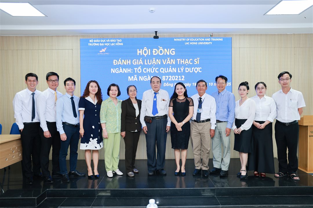 Ngày 19 tháng 10 năm 2025, tại phòng B203 cơ sở 1 của Trường Đại học Lạc Hồng (LHU), 06 học viên thuộc ngành Tổ chức quản lý dược đã hoàn thành phần trình bày và bảo vệ luận văn thạc sĩ trước hội đồng chuyên môn. Buổi bảo vệ diễn ra trong không khí trang nghiêm, học thuật và chuyên nghiệp, đánh dấu cột mốc quan trọng trong quá trình đào tạo sau đại học tại nhà trường.
