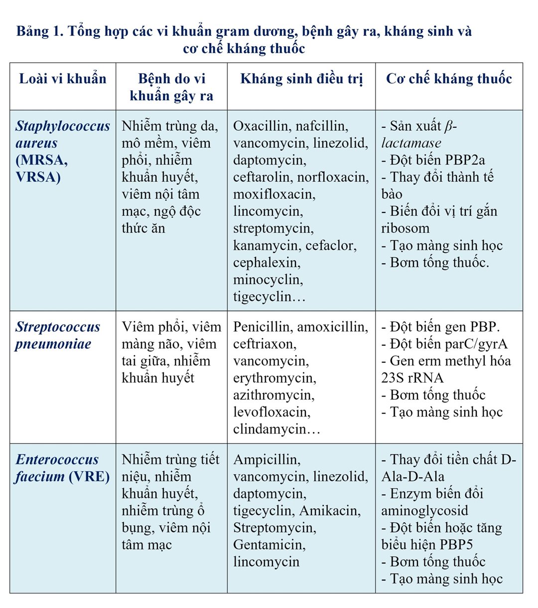 Tình trạng kháng kháng sinh của vi khuẩn Gram dương đang gia tăng nhanh chóng, trở thành vấn đề toàn cầu nghiêm trọng ảnh hưởng đến hệ thống y tế và kinh tế. Bao gồm: Staphylococcus aureus, Streptococcus pneumoniae và Enterococcus faecium. Các cơ chế kháng thuốc chủ yếu ở vi khuẩn Gram dương như bất hoạt enzyme, biến đổi đích tác dụng, giảm hấp thu thuốc và tăng cường bơm đẩy thuốc.