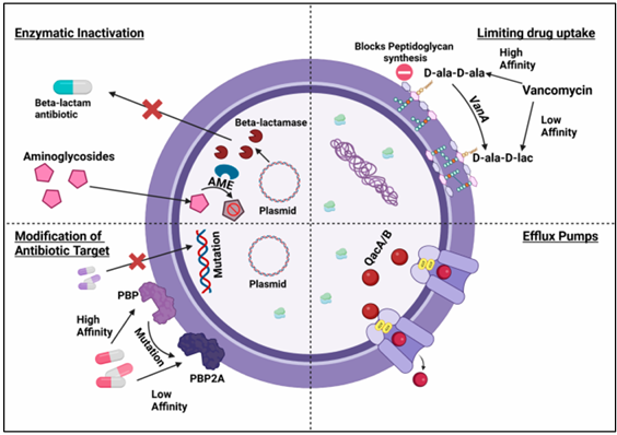 Rajput P, Nahar KS, Rahman KM. Evaluation of Antibiotic Resistance Mechanisms in Gram-Positive Bacteria. Antibiotics (Basel). 2024 Dec 8;13(12):1197. doi: 10.3390/antibiotics13121197. PMID: 39766587; PMCID: PMC11672434.