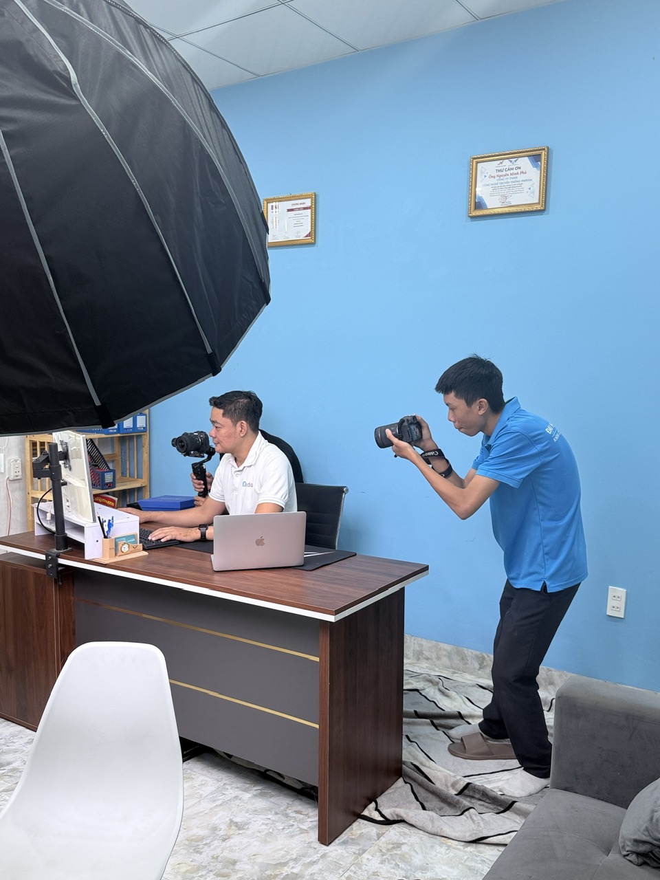Phu is conducting an interview video with Ms. Nhu Ngoc, a lecturer in the Multimedia Communication program.